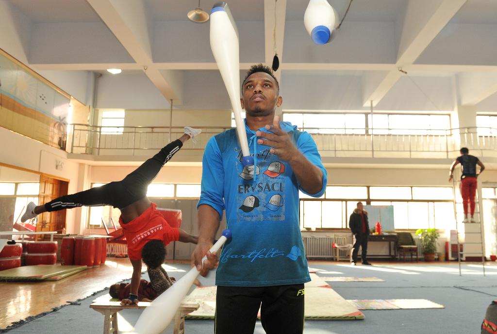 2018年1月25日,在吴桥杂技艺术学校,来自埃塞俄比亚的留学生依布萨(中)在练习杂技。