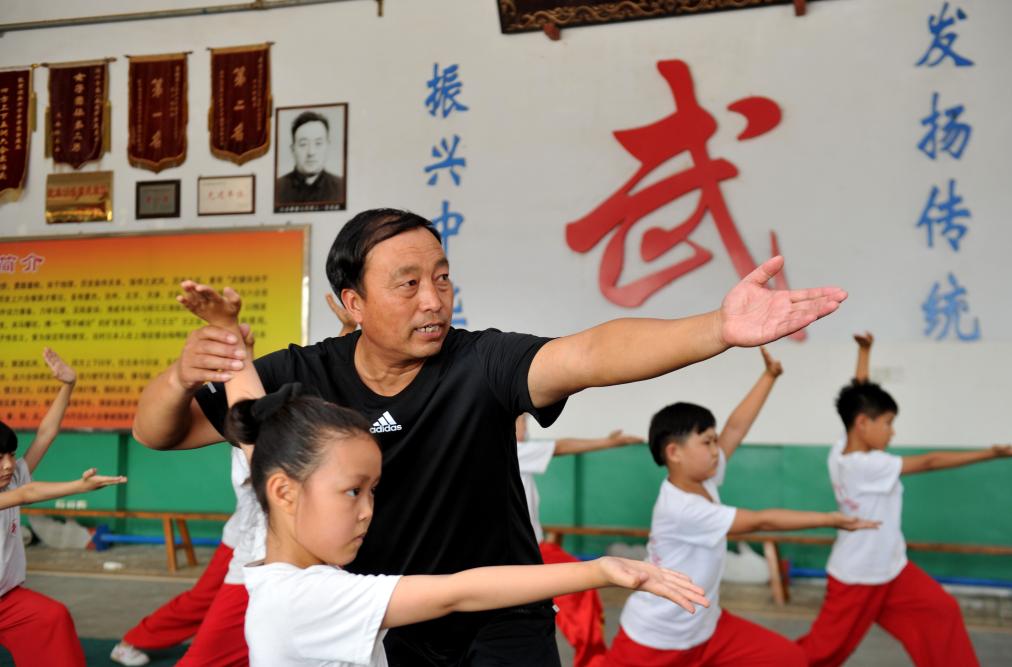 2017年6月17日,石同鼎(中)在泊头六合武馆内教授小学生六合拳法。