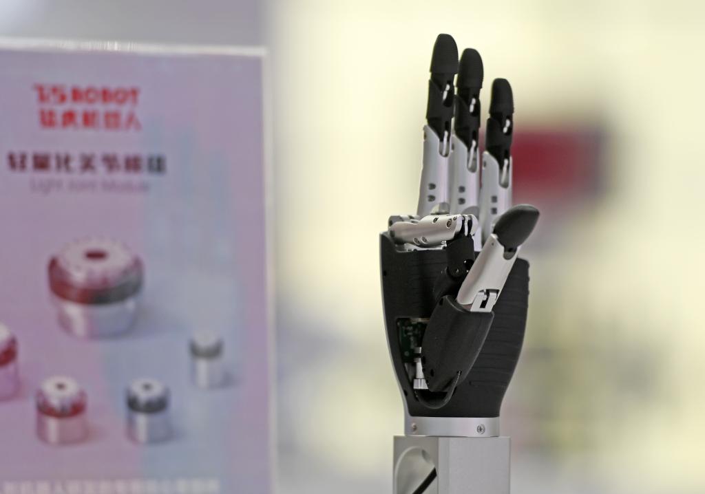 在智博会现场拍摄的一款轻量化关节模组手臂。 新华社记者 赵子硕 摄