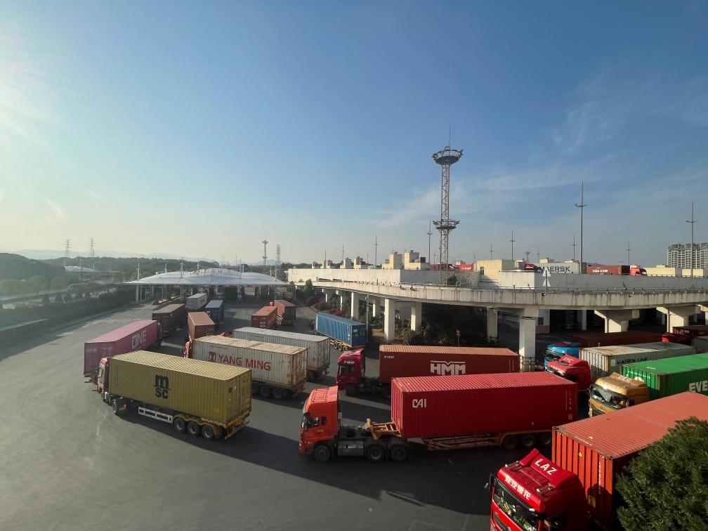 图为义乌港海关监管场所内等待驶往宁波舟山港出海的集装箱卡车。受访者供图