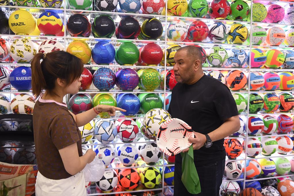 5月30日,义乌国际商贸城的商户(左)向埃及客商介绍足球产品。新华社记者 黄宗治 摄