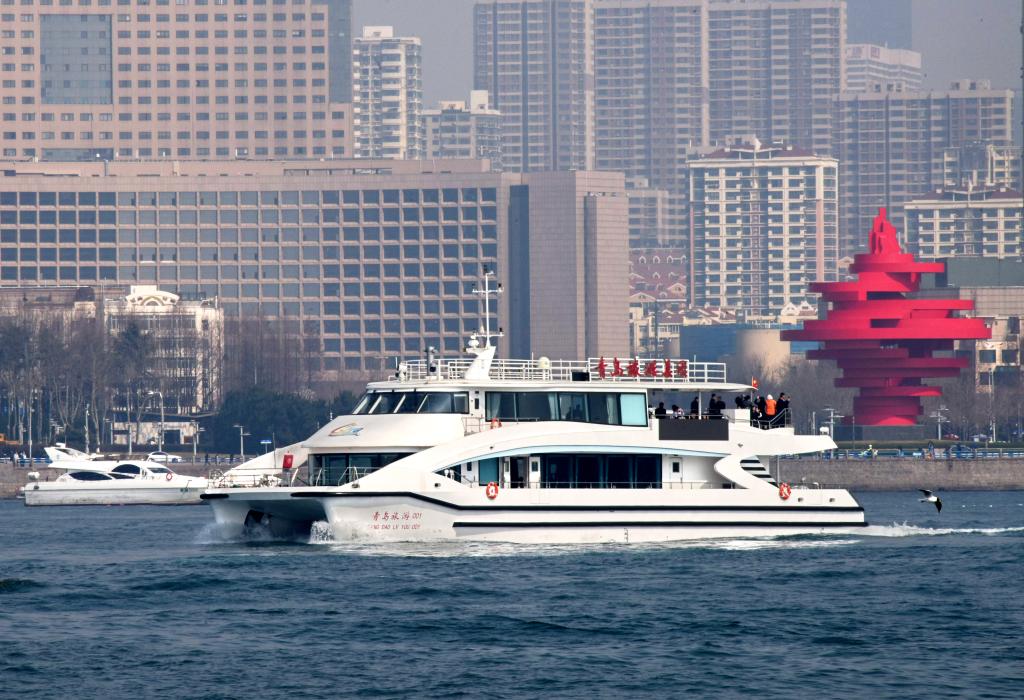 一艘游船行驶在青岛浮山湾沿岸。新华社记者 李紫恒 摄