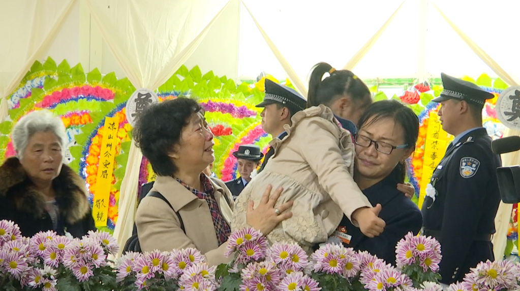 2017年6月16日,告别贾巴伍各的追悼会上,女儿向他伸出大拇指。新华社发(凉山州公安局供图)