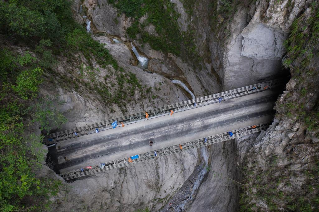 俯瞰四川省布拖县阿布洛哈村通村公路2、3号隧道之间的钢桥。新华社记者 江宏景 摄