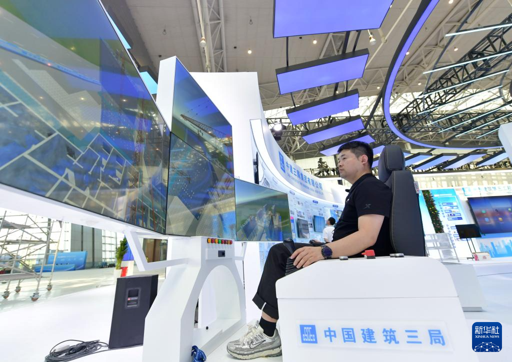 6月25日,参展商在中建三局展位调试5G塔机模拟驾驶舱。新华社记者 王菲 摄