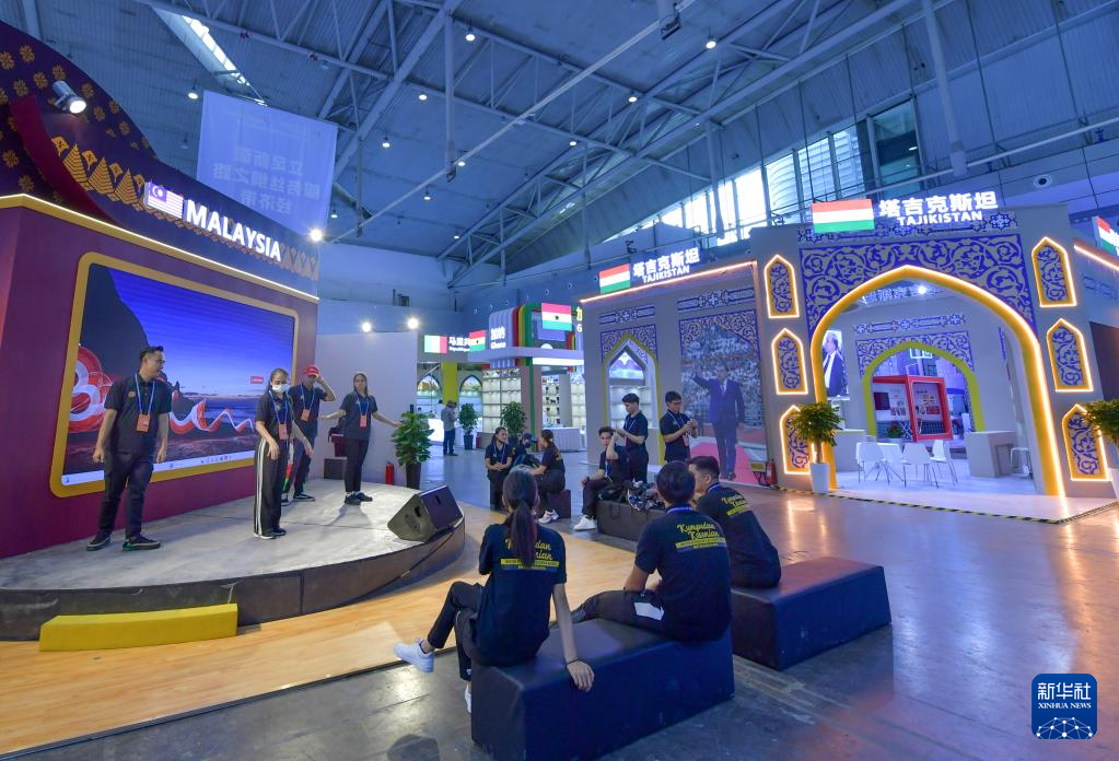6月25日,马来西亚参展商在展位排练文艺演出。新华社记者 王菲 摄