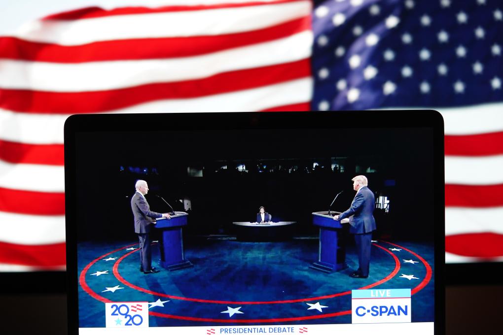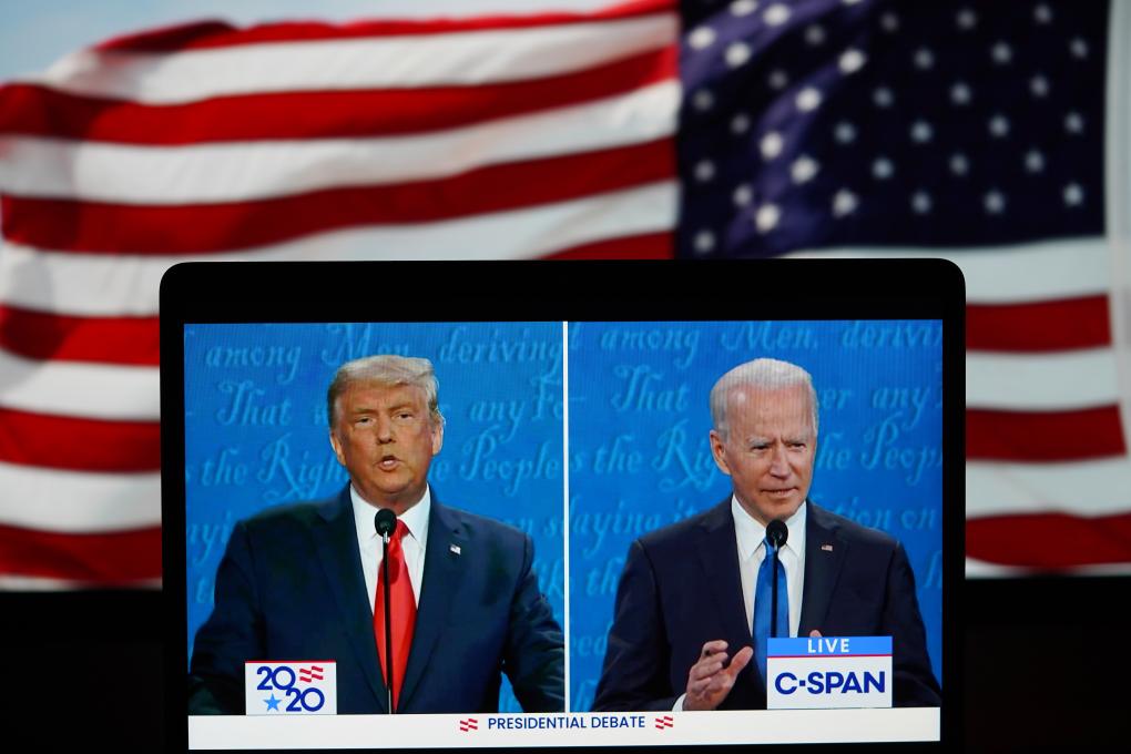 2020年10月22日在美国弗吉尼亚州阿灵顿拍摄的视频画面显示,时任美国总统特朗普(右)与时任民主党总统候选人拜登(左)在田纳西州纳什维尔市参加最后一场总统候选人电视辩论。新华社记者刘杰摄