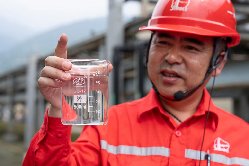 6月25日,在重庆市涪陵区白涛镇油坊村的涪陵页岩气田白涛产出水处理站,工作人员展示处理合格的产出水。