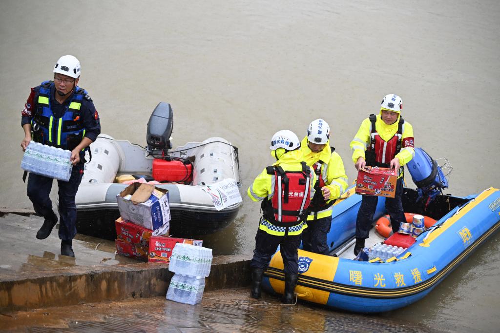 戴着眼镜、皮肤黝黑的胡建生双脚蹚在水中,接过队友递来的矿泉水,码放在身旁的救援艇内。飞溅的水花将他们全身打得透湿,原本淹过脚踝的水没多久便没过靴筒。
