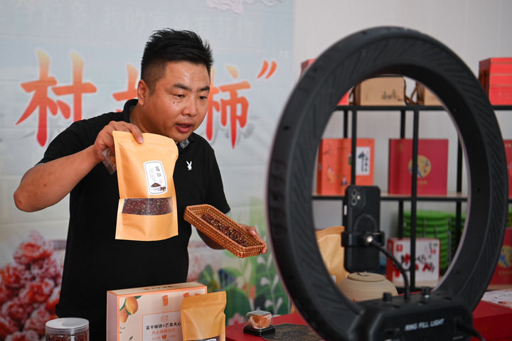 主播在富平县庄里镇杨家村新农人柿子产业园直播带货(6月22日摄)。 新华社记者 邹竞一 摄