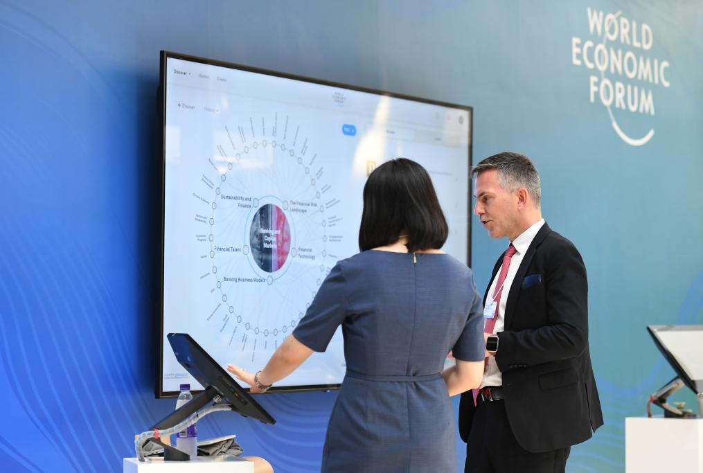 6月26日,在夏季达沃斯论坛主会场大连国际会议中心,嘉宾参与互动讨论。新华社记者章磊 摄