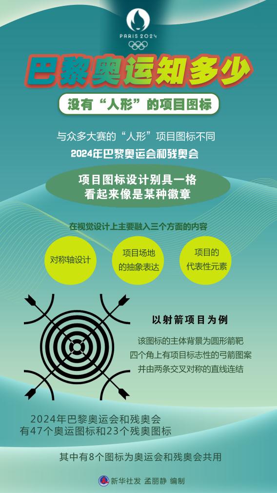 2024年巴黎奥运会和残奥会有47个奥运图标和23个残奥图标,其中有8个图标为奥运会和残奥会共用。此次巴黎奥运会项目图标在视觉设计上主要融入三个方面的内容——对称轴设计、项目场地的抽象表达以及项目的代表性元素。
