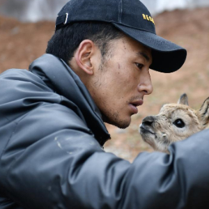 2020年7月7日,在可可西里卓乃湖保护站,保护队员才文多杰照顾一只藏羚羊幼仔。新华社记者 张龙 摄