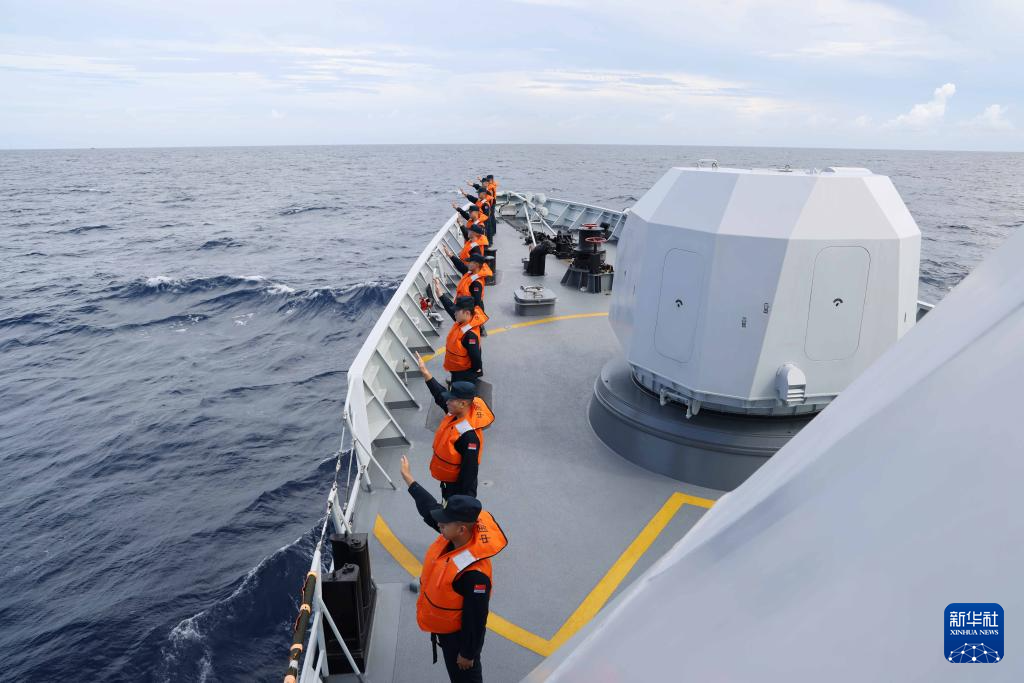 6月27日,中越第36次北部湾联合巡逻结束,中方舰艇官兵向越方舰艇官兵挥手告别。新华社发(周璐瑶 摄)