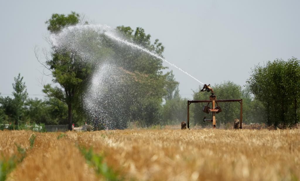 6月25日,在山东省德州市临邑县临南镇,灌溉设备正在作业。(新华社记者 徐速绘 摄)