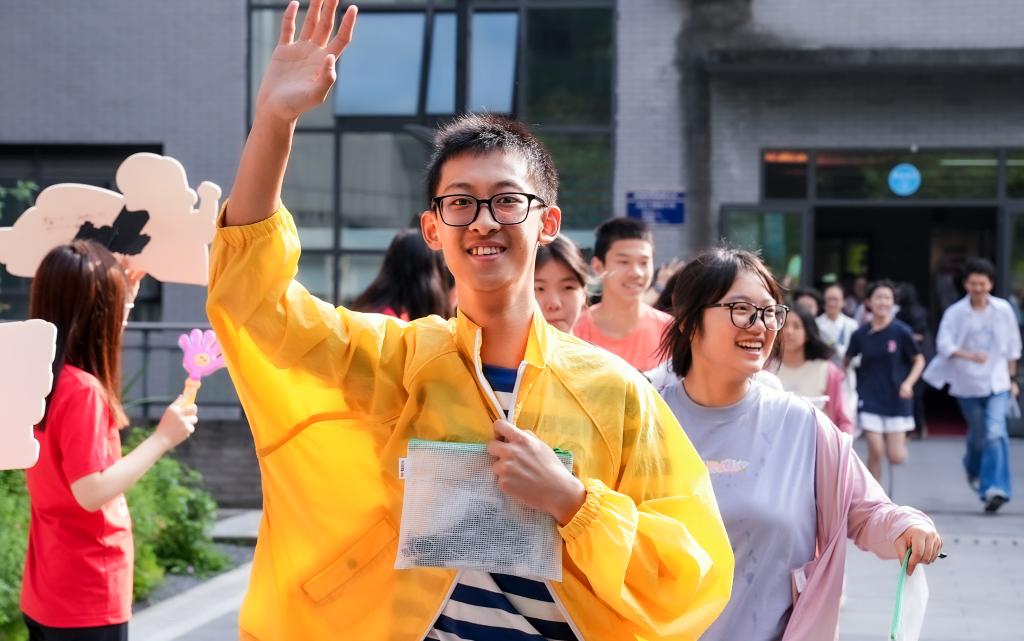 在西南大学附属中学,中考考生在老师们的加油声中走入考场。(龙川 摄)