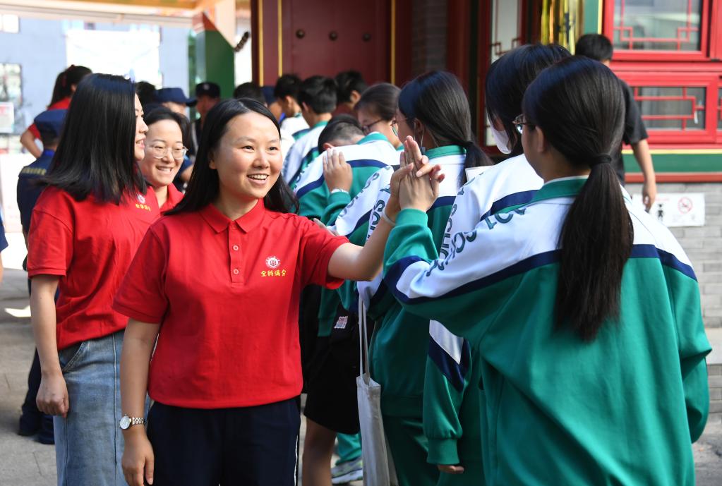 6月24日,在北京一零一中双榆树校区考点,考生进入考点前与老师击掌。当日,2024年北京市初中学业水平考试正式拉开帷幕。新华社记者 任超 摄
