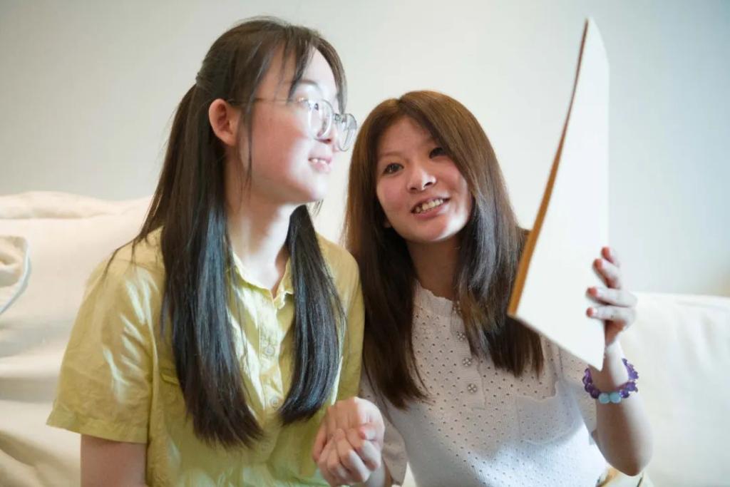 6月25日,查询高考文化课分数之前,郁晓楠(右)在家中与辅导自己英语的大学生鲍诗蕊交流。新华社记者 张端 摄