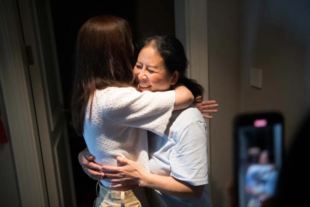 6月25日,郁晓楠(左)在家中查到自己的高考文化课分数后与妈妈孙如奥抱在一起。新华社记者 张端 摄