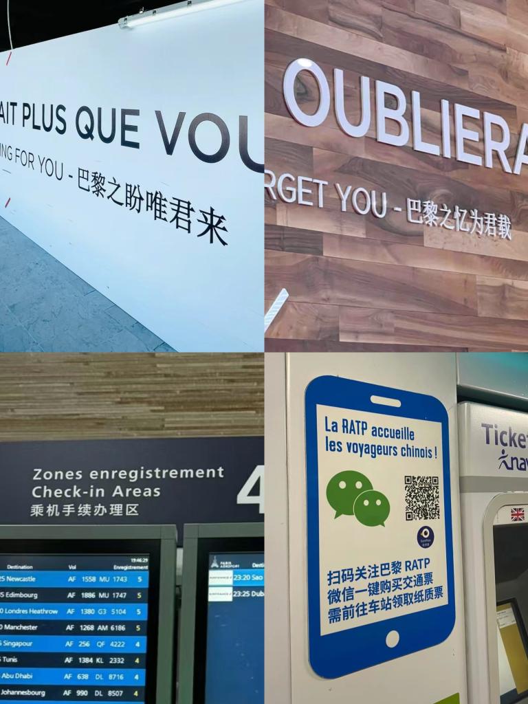 巴黎戴高乐机场的中文标识以及地铁站里的微信购票广告