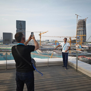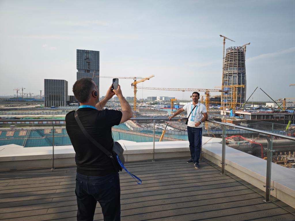 在雄安新区东西轴线调度指挥中心,代表们考察了东西轴线及雄安城际站片区建设进展情况,并纷纷以雄安新区最高建筑之一“金芦苇”为背景,拍照留念。