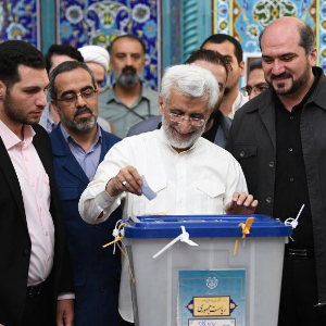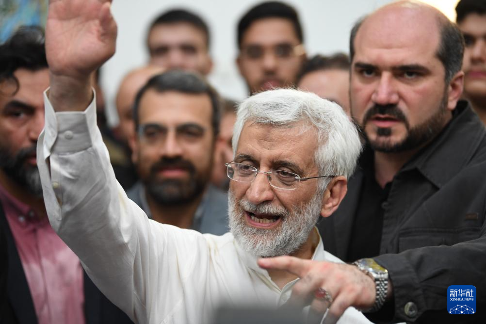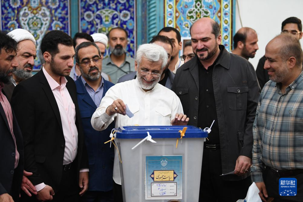 6月28日,在伊朗德黑兰,总统候选人、前首席核谈判代表贾利利(前中)在一处投票站参加总统选举投票。新华社记者 沙达提 摄
