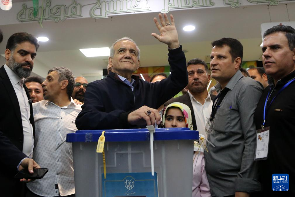 6月28日,在伊朗德黑兰,总统候选人、前卫生部长佩泽什基安(中)在一处投票站参加伊朗第14届总统选举投票。新华社发