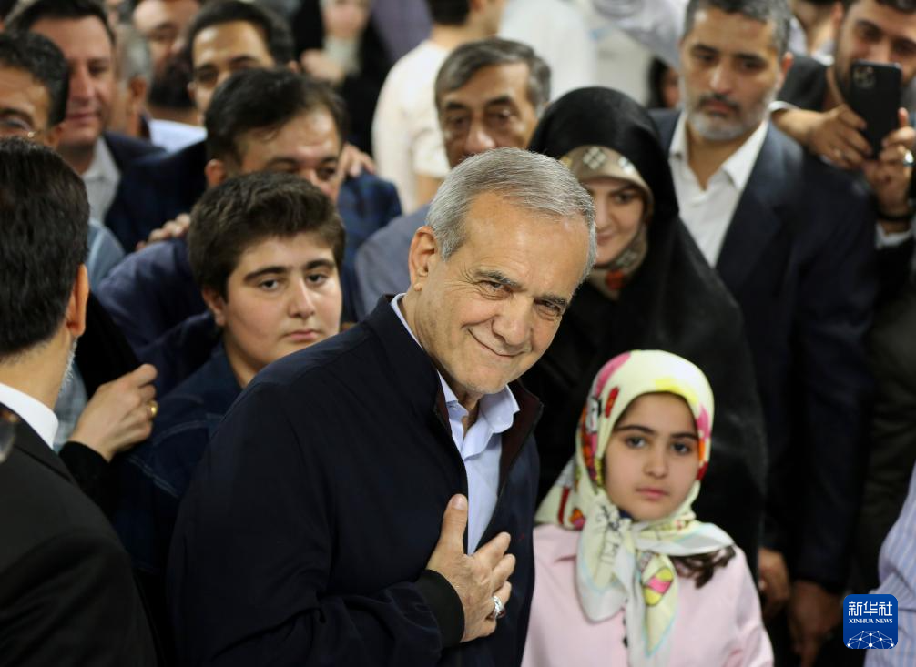 6月28日,在伊朗德黑兰,总统候选人、前卫生部长佩泽什基安(前中)在一处投票站参加伊朗第14届总统选举投票。新华社发