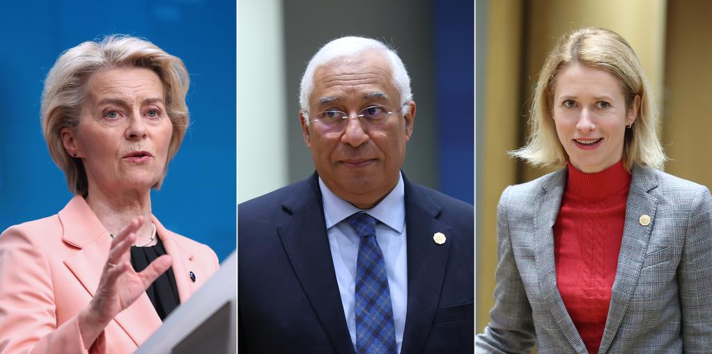 这是欧盟委员会主席冯德莱恩(左)、时任葡萄牙总理科斯塔(中)和爱沙尼亚总理卡拉斯的资料照片拼版。新华社记者赵丁喆摄
