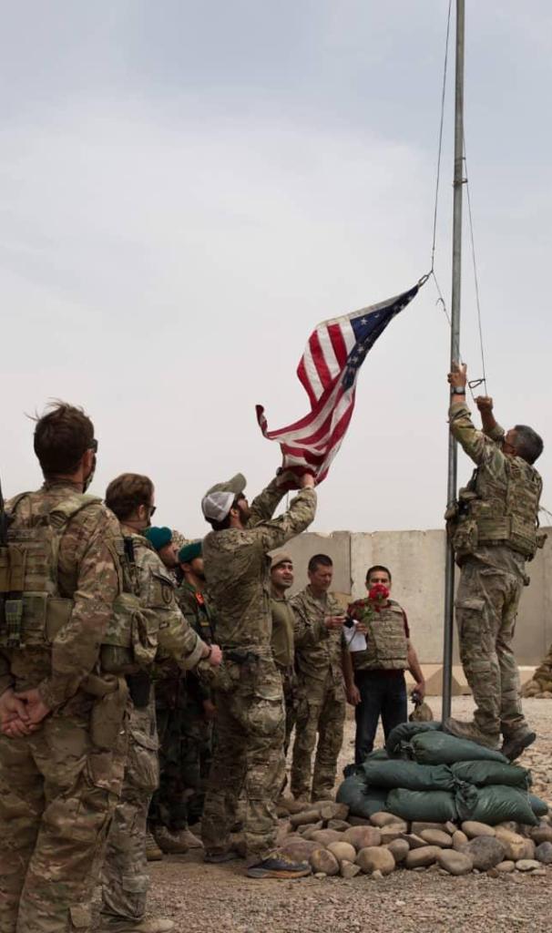 2021年5月2日,美军士兵在阿富汗赫尔曼德省一处军事基地降下美国国旗。当日,美军向阿富汗国民军移交这处军事基地。美国和北约军队5月1日起正式开始撤离阿富汗,计划在9月11日前撤完。新华社发(阿富汗国防部供图)