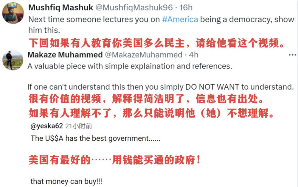 此外,南非科学家蒂姆·诺克斯、肯尼亚媒体人雷西安·勒拜、印度媒体人坦莫伊·易卜拉欣等专家也转评视频。有网友调侃:“美国有最好的……用钱能买通的政府!”