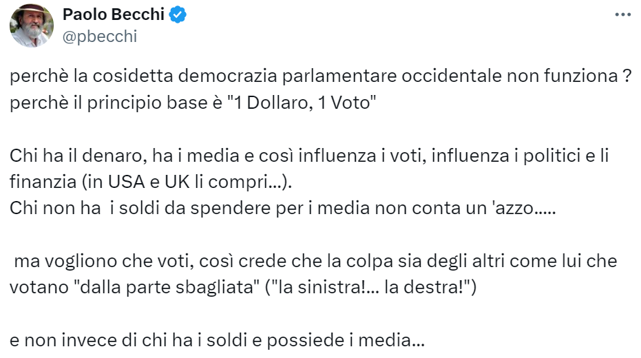 意大利哲学家保罗·贝基说:“谁有钱,谁就拥有媒体,从而影响选票……没有钱花在媒体上的人根本无关紧要。但有钱人希望没钱的(也)投票,让他以为其他投票‘站在错误一边’的人应该受到指责,而不是那些有钱的、掌握媒体的人。”