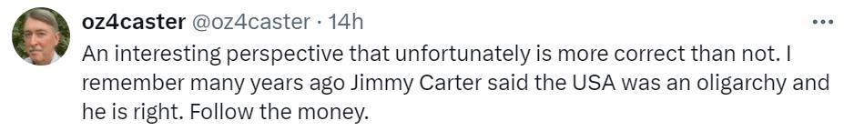 有美国网友评论:“有趣的视角,不幸的是很中肯。我记得多年前吉米·卡特说美国是寡头政治,他是对的。向钱看。”2015年,卡特在一次采访中表示美国已是“政治贿赂无限制的寡头政治”。