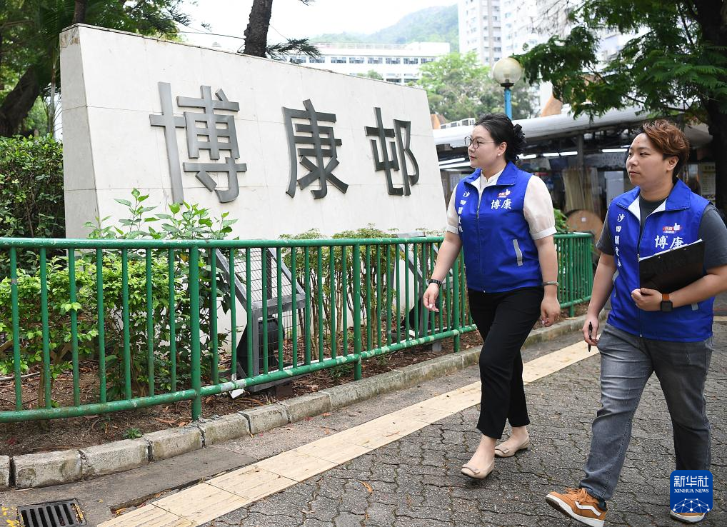 4月18日,博康关爱队队长、沙田区区议员郭宣彤(左)与队员从博康邨内走过。新华社记者 陈铎 摄