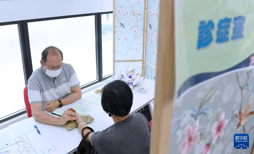 4月11日,在荃湾区马湾中医义诊活动中,一名中医师为居民号脉。新华社记者 陈铎 摄
