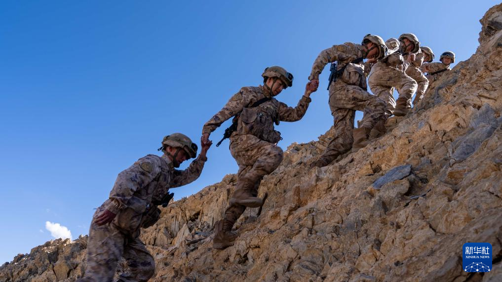 西藏阿里军分区普尔楚边防连秋迪俭革拉哨所巡逻官兵在巡逻途中爬越陡峭山坡(6月29日摄)。新华社发(戴学武 摄)