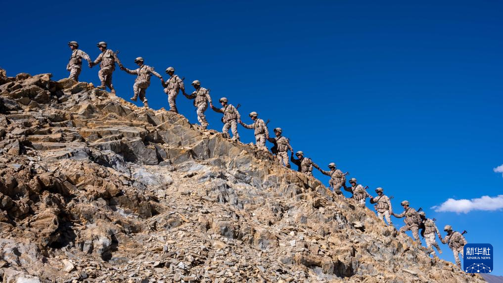 西藏阿里军分区普尔楚边防连秋迪俭革拉哨所官兵在海拔5100米的高原执勤站哨(6月29日摄)。新华社发(戴学武 摄)