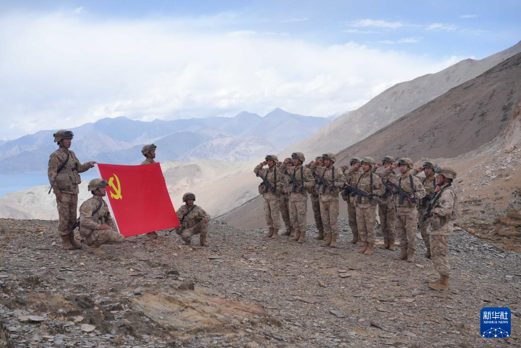 西藏阿里军分区普尔楚边防连秋迪俭革拉哨所巡逻官兵在海拔5700米的巡逻点位组织重温入党誓词活动(6月29日摄)。新华社发(戴学武 摄)