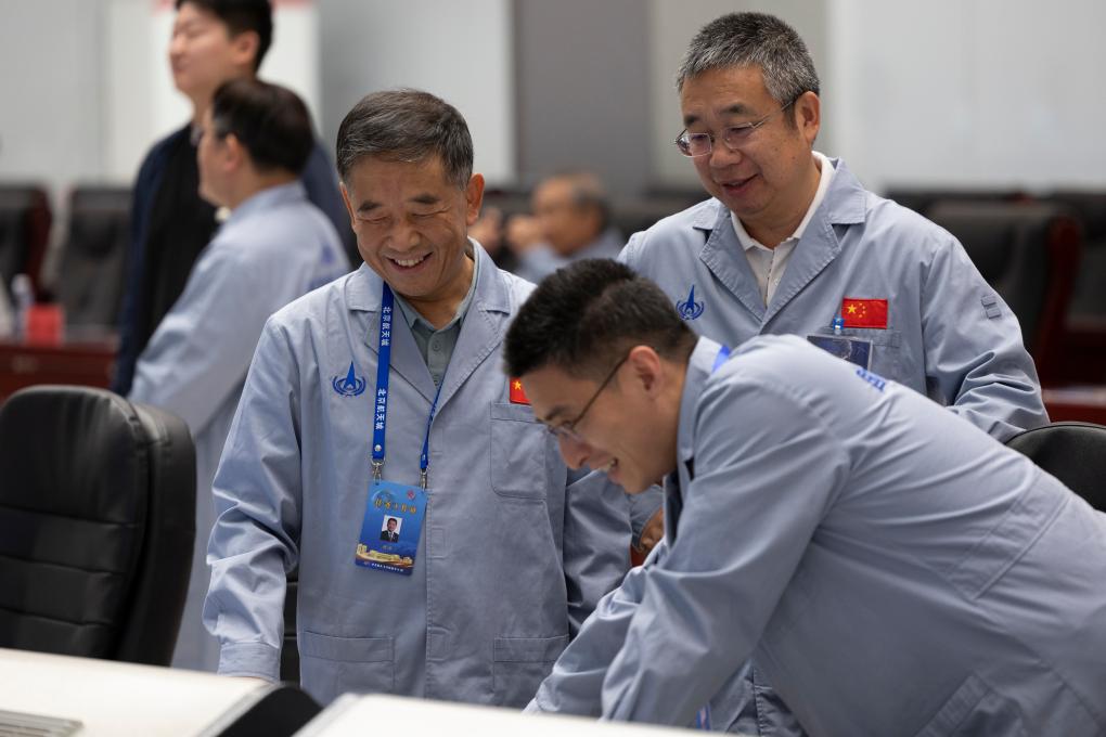 6月4日,在北京航天飞行控制中心,嫦娥六号任务总设计师胡浩(左)、长征五号运载火箭总设计师李东和嫦娥六号任务副总设计师王琼(前)交流嫦娥六号任务进展情况。新华社记者 金立旺 摄