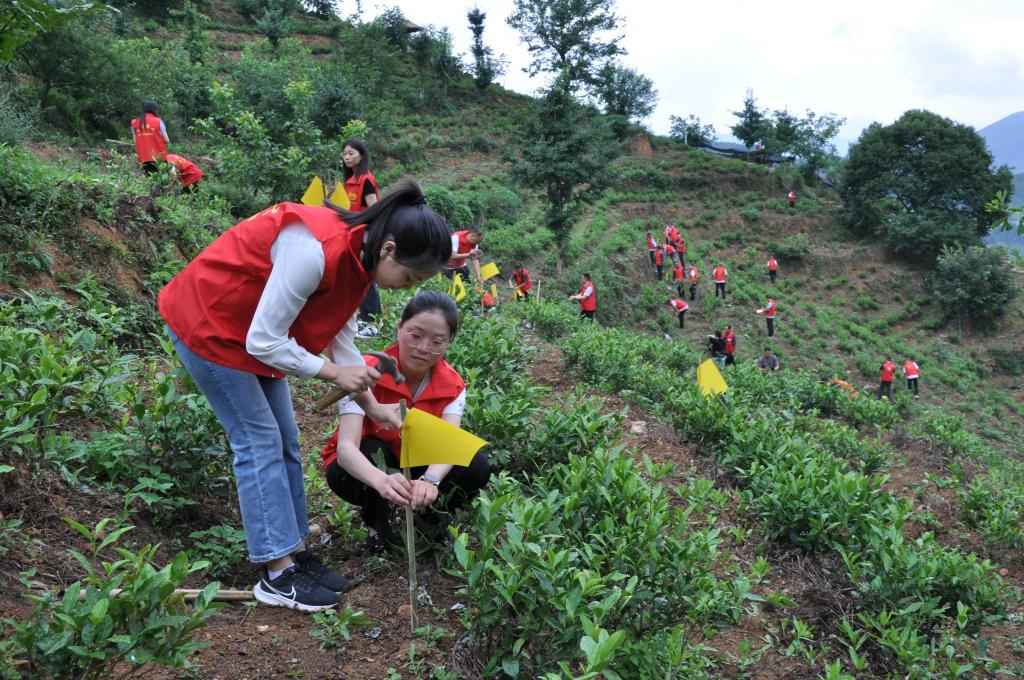 6月27日,四川省广元市青川县党员在沙州镇青坪村“白叶一号”茶叶基地开展志愿服务。(青川县委组织部供图)