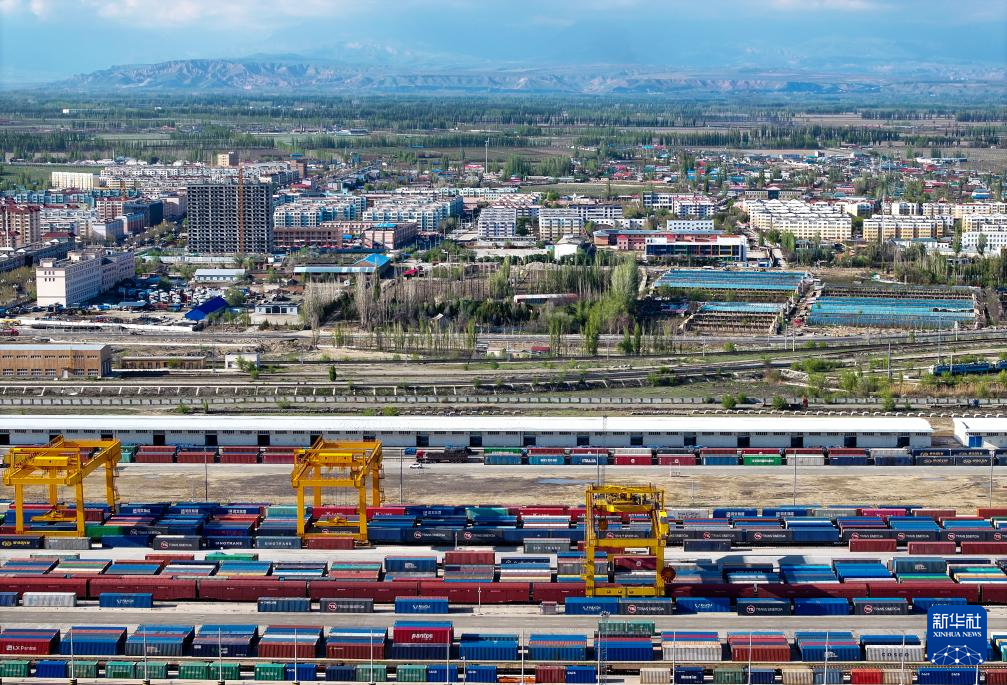 在新疆乌鲁木齐国际陆港区,集装箱装卸作业有序进行(2024年5月27日摄)。新华社记者 王菲 摄