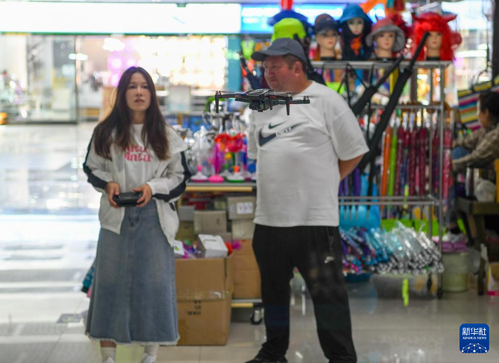 一位来自吉尔吉斯斯坦的顾客在中哈霍尔果斯国际边境合作中心里挑选无人机(6月10日摄)。新华社记者 赵戈 摄