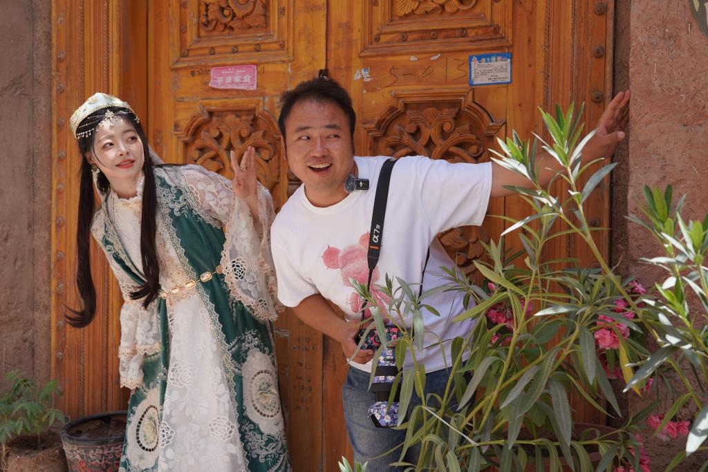 吴振浩(右)在喀什古城中教顾客摆动作。新华社记者 郭燕 摄
