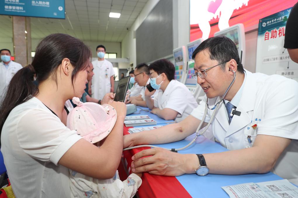 在临汾市中心医院,刘辉(右)在义诊中为一名儿童检查(2024年6月18日摄)。新华社记者 刘扬涛 摄
