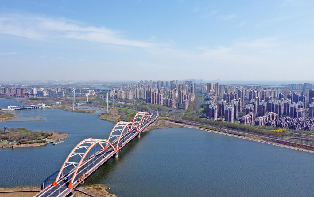 在天津市滨海新区永定新河和蓟运河汇合处拍摄的中新天津生态城一景(2022年4月14日摄,无人机照片)。新华社记者 赵子硕 摄