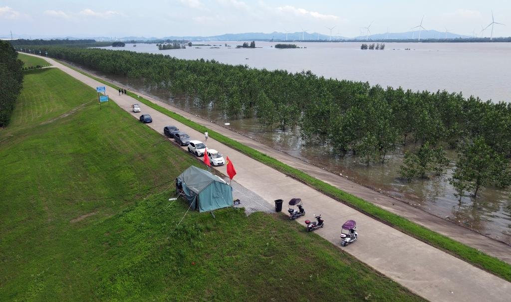 7月2日,谭康在同马大堤宿松段查看长江水位。新华社记者 周牧 摄