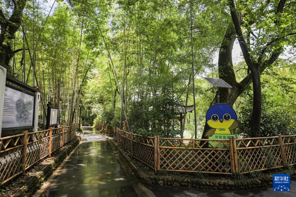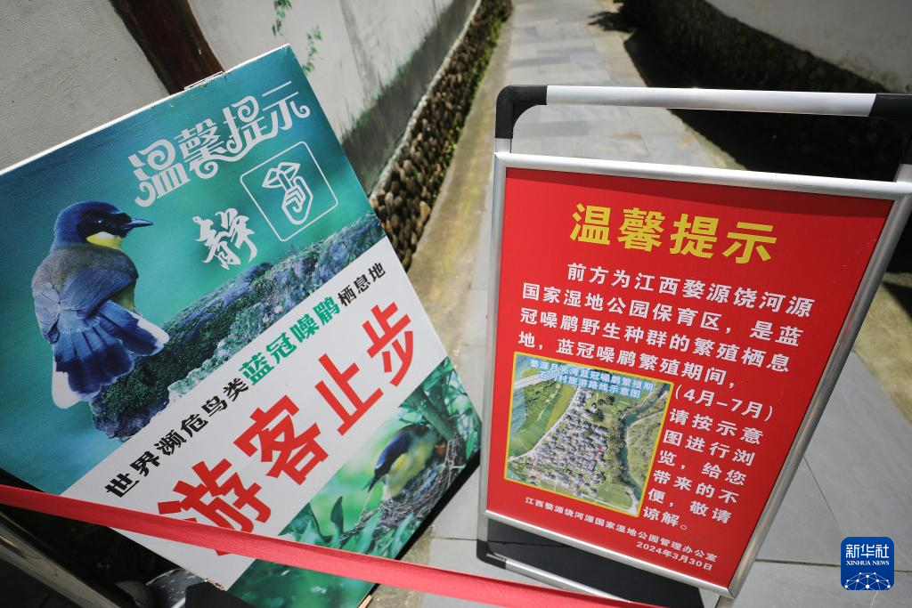7月3日在江西婺源石门村拍摄的蓝冠噪鹛栖息地前的公告牌,告知游客蓝冠噪鹛繁殖期间不得进入。 新华社记者 杜潇逸 摄