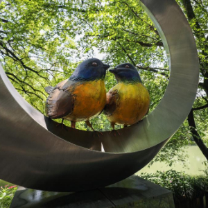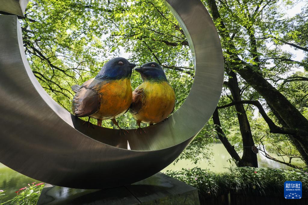 7月3日在江西婺源石门村拍摄的蓝冠噪鹛雕塑。 新华社记者 杜潇逸 摄