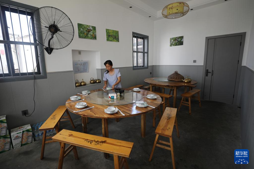 7月3日,在江西婺源石门村村民王土英的农家乐里,工作人员在摆放餐具。 新华社记者 杜潇逸 摄