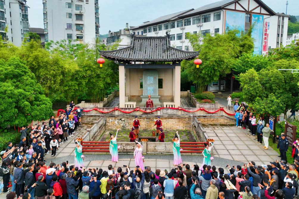 游客在江西宜春温汤镇温汤古井观看表演。(陈旅 摄)